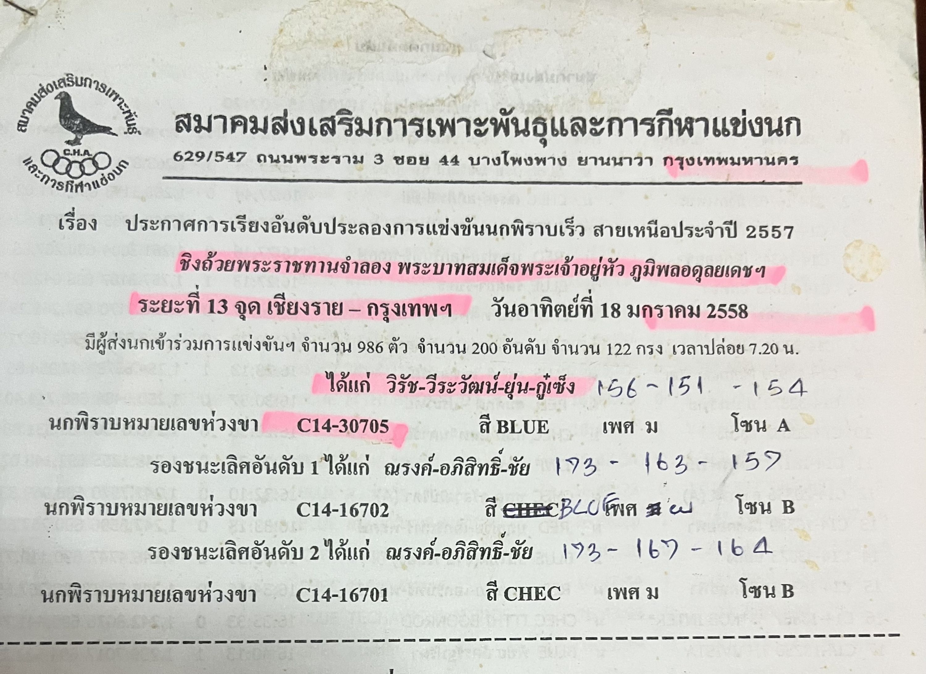 แต่โชคก็ได้เข้าข้างนกตัวนี้ มีนกแข่งที่มีปัญหาทำให้มีกล่องว่างสำหรับมันพอดี